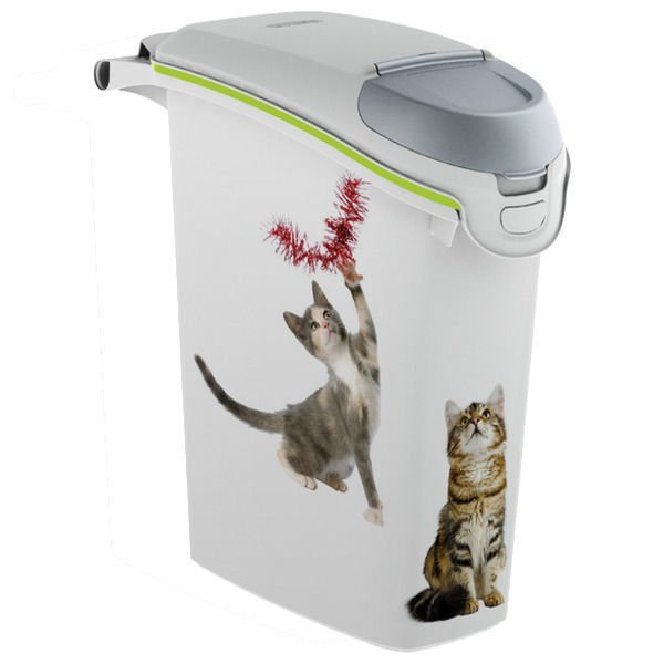 Pojemnik na karmę dla kotów Curver pomieści 23L. karmy co odpowiada około 10kg. Wykonane z elastycznego, wytrzymałego na zarysowania i pęknięcia plastiku. Pomysłowy system podwójnego otwierania pozwala na szybkie nasypanie świeżej karmy do pojemnika, a dzięki mniejszej pokrywce można nakładać małe porcje karmy bez zbędnego wietrzenia pojemnika. Wygodny uchwyt pozwala na łatwe przenoszenie pojemnika, a zastosowana gumowa uszczelka utrzymuje zapach i świeżość karmy wewnątrz.