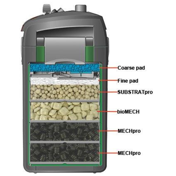 W filtrze Eheim 2075 oprócz umiejscowionego na samej górze pojemnika prefiltra, znajdują się 3 pojemniki na wkłady filtracyjne wypełnione oryginalnymi wkładami firmy Eheim.