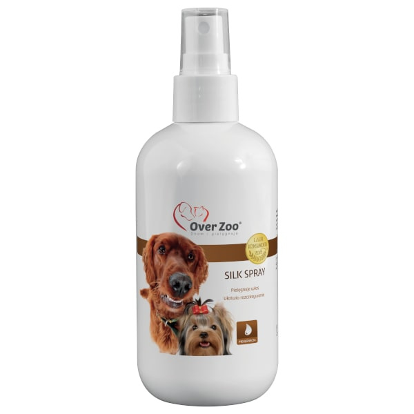 Over Zoo Silk Spray to preparat dzięki któremu łatwo i szybko można rozczesać szatę pupila. Naturalne woski roślinne wygładzają włos, nadając mu poślizgu, który ułatwia czesanie. Dzięki właściwościom włosa po zastosowaniu sprayu nie dochodzi do nadmiernej utraty podczas szczotkowania. Po nałożeniu preparatu sierść staje się lśniąca i nawilżona. Produkt posiada działanie antystatyczne, nie przetłuszcza sierści, oraz ma neutralne, dostosowane do skóry psa PH. Łatwy w rozprowadzeniu za sprawą atomizera, który równomiernie rozpyla Silk Spray.