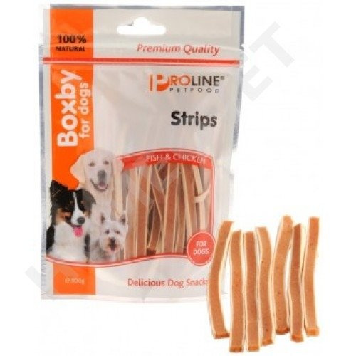 Boxby Strips Chicken and Fish to paski mięsa z kurczaka z dodatkiem ryby. Boxby idealnie sprawdzi się jako dodatek do stałego menu Twojego psa. Przekąska jest miękka, więc z łatwością można ją dzielić na mniejsze części i może być podawana małym psom.