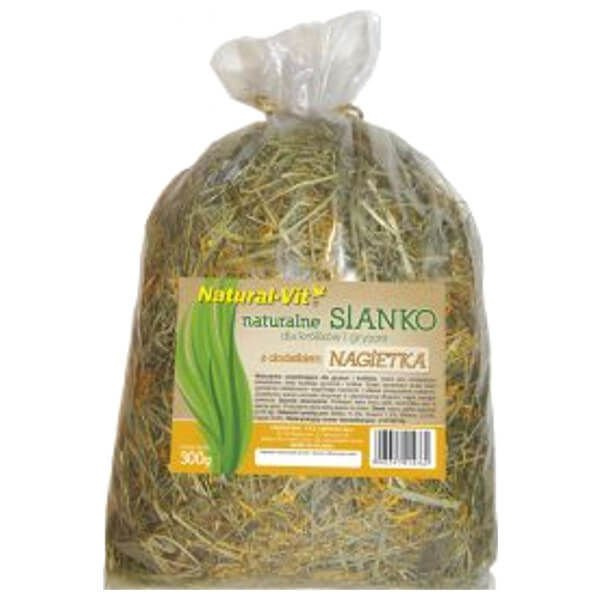Aromatyczne i naturalne Natural-Vit sianko z nagietkiem dla królika, gryzoni, które stanowi niezbędny składnik diety. Dzięki zawartości dużej ilości substancji balastowych wspomaga trawienie i ułatwia przesuwanie pokarmu. Dodatkowo siano pozwala utrzymać w odpowiedniej długości ciągle rosnące siekacze gryzoni i królików. Dzięki zawartości kwiatów nagietka wpływa korzystnie na czynności przewodu pokarmowego, reguluje pracę wątroby i łagodzi skutki zatruć pokarmowych.
