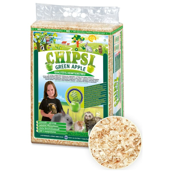 Produkty dla zwierząt firmy CHIPSI zapewniają optymalną czystość i higienę, dzięki latom badań nad roślinną ściółką dla zwierząt. Drewno użyte do produkcji trocin naturalnie jest szczególnie dobre w wiązaniu wilgoci. Drewniana ściółka Chipsi green apple to trociny posiadające naturalny zapach drewna wzbogacony o zapach soczystych jabłek. Jest też jednym z prostych i podstawowych podłoży dla małych ssaków. Bezpyłowe zrębki z drewna iglastego, pochodzące ze świerku i jodły, są naturalnie chłonne, wydzielają przyjemny zapach i zapewniają czyste środowisko.