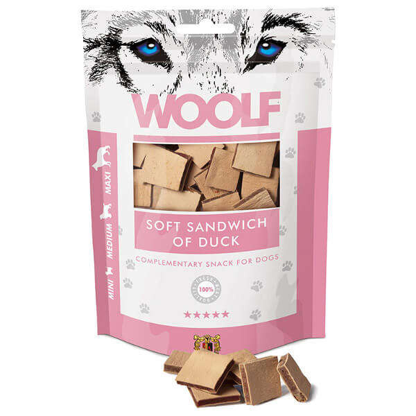 Woolf n Soft sandwich of Duck to przysmak z kaczki, zawierający wysokiej jakości źródło protein. Jest wolny od konserwantów, chemicznych dodatków i barwników. Produkt sprzedawany jest w opakowaniu strunowym, aby po otwarciu można było stale zachowywać świeżość przysmaków. Pokarm wprowadza urozmaicenie do diety. Można podawać w formie nagrody (np. podczas tresury), lub po prostu jako przekąskę.