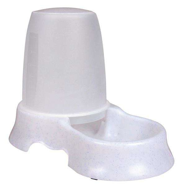 Automatyczne poidło lub karmidło Trixie, wykonane z wysokiej jakości plastiku. Otwierany od góry pojemnik z dwoma otworami, na wodę lub karmę. Plastik jest przezroczysty co pozwala na stałą kontrolę zawartości. Nie ślizga się, dzięki gumowym nóżkom na podstawie. Poidło można myć w zmywarce, ale przed myciem, należy usunąć wszystkie gumowe części. Taka forma karmidła umożliwia psu lub kotu dostęp do większych zasobów karmy (lub wody), bez konieczności bardzo częstego uzupełniania jej przez opiekuna. Idealne rozwiązanie sprawdzające się na wyjeździe, urlopie czy wakacjach z Twoim psem lub kotem.