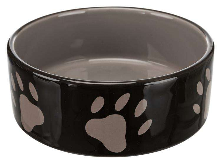 Ekskluzywnie wyglądająca ceramiczna miska w kolorze czarnym, zdobiona szarym motywem łapek na obwodzie, wewnątrz szara emalia.