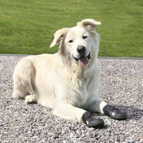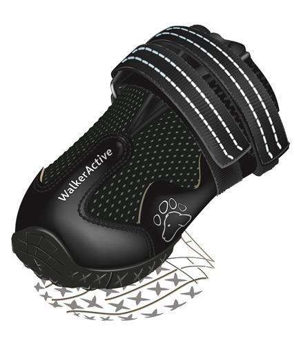 Trixie buty ochronne dla psa Walker Active posiadają wytrzymałą podeszwę, która zapewnia przyczepność. Łapa psa cały czas "oddycha" dzięki wszytej specjalnej siateczce. Buty są komfortowe do noszenia i bardzo trwałe. Posiadają wygodne zapięcia na rzepy i elementy odblaskowe, idealna na wieczorne spacery. Dodatkowym, ważnym atutem, tego psiego obuwia jest funkcja wspomagająca szybkie leczenie zranień łapy. Buty są idealne na kamienne podłoże, asfalt bądź gorący piasek. W znacznym stopniu zmniejszają ryzyko infekcji psiej łapy. Chronią przed żwirem i solą w zimie.