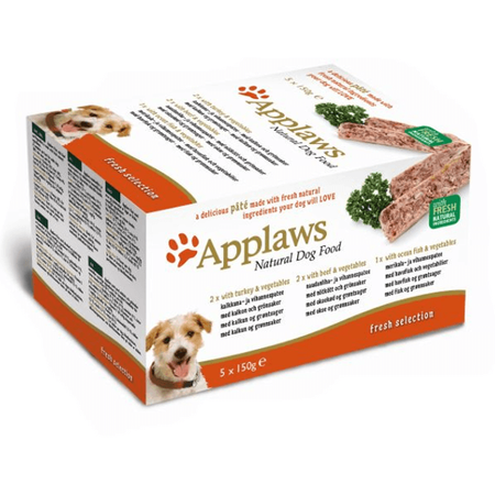 Multipak 5 pasztetów Applaws fresh selection 5x150 g , dla dorosłych psów, zawiera trzy rodzaje wymieszanych smaków: indyk, wołowina i ryba oceaniczna z warzywami. Karma przygotowywana ze świeżych i naturalnych składników. Kompletna mokra karma dla dorosłych psów zawiera minimum 58% mięsa i ryby.
