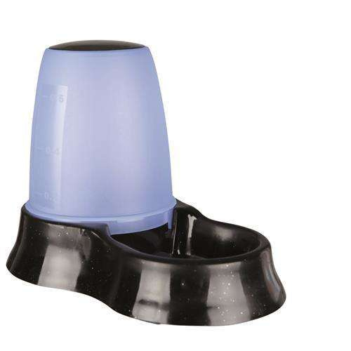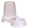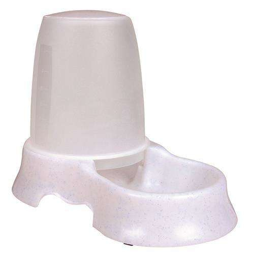 Automatyczne poidło lub karmidło Trixie, wykonane z wysokiej jakości plastiku. Otwierany od góry pojemnik z dwoma otworami, na wodę lub karmę. Plastik jest przezroczysty co pozwala na stałą kontrolę zawartości. Nie ślizga się, dzięki gumowym nóżkom na podstawie. Poidło można myć w zmywarce, ale przed myciem, należy usunąć wszystkie gumowe części. Taka forma karmidła umożliwia psu lub kotu dostęp do większych zasobów karmy (lub wody), bez konieczności bardzo częstego uzupełniania jej przez opiekuna. Idealne rozwiązanie sprawdzające się na wyjeździe, urlopie czy wakacjach z Twoim psem lub kotem.