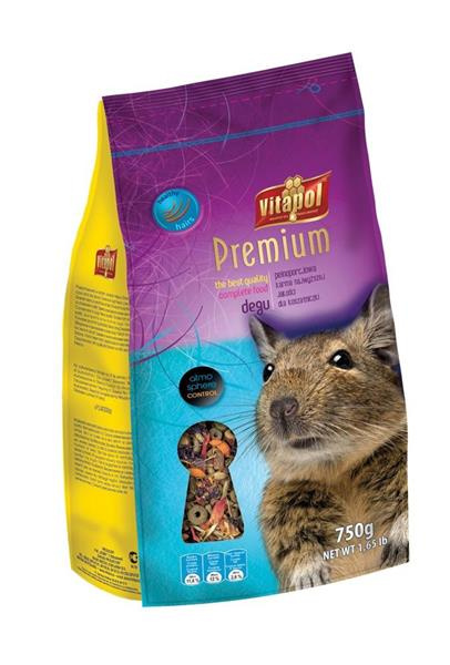 Pełnoporcjowy pokarm Vitapol dla koszatniczek bogaty w granulaty i witaminizowane ekstrudaty. Z ograniczoną zawartością zbóż, o zróżnicowanym, bogatym składzie. Bogaty w związki pozytywnie wpływające na układ immunologiczny. Zapewnia lśniącą sierść oraz zdrowe zęby, bogata w warzywa, owoce i zioła o niskiej zawartości cukru, z naturalnymi witaminami oraz związkami mineralnymi. Pełnoporcjowa mieszanka dla koszatniczek, odpowiednio zbilansowana, w której zboża zostały całkowicie zastąpione przez różnego rodzaju granulatami i witaminizowanymi ekstrudatami. Ich różnorodność zapewnia dostęp do szerokiej gamy składników pokarmowych, witamin i minerałów. W szerokim składzie znajdują się najlepszej jakości warzywa (m.in. marchew, burak, pasternak, brokuł), owoce (m.in. jarzębina i jałowiec) oraz zioła (m.in. nagietek, malwa, płatki róży, hibiskus). Niskokaloryczny brokuł dostarcza witaminy A, E, K1, C, B1 oraz potas, fosfor, wapń, żelaza i chrom. Pasternak dostarcza witaminę C i B. Owoce jarzębiny zawierają duże ilości witaminy C, E, P, K, PP, A, a do tego poprawia trawienie i działa przeciwbiegunkowo. Płatki róży witaminizują i wzmacniają organizm, nagietek wspomaga trawienie i działa przeciwbakteryjnie, hibiskus jest bogaty w witaminę C. Kora brzozy, wierzby oraz gałązki brzozy dbają o prawidłowy proces ścierania siekaczy.