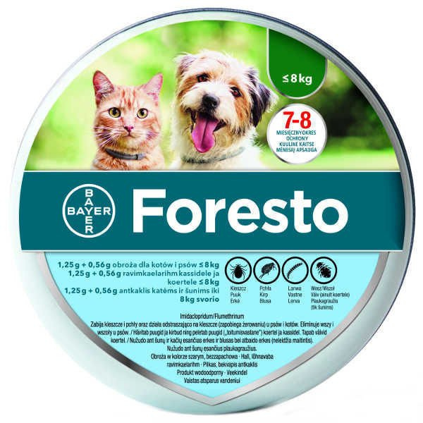 Psy: W celu leczenia i zapobiegania infestacji pcheł (Ctenocephalides felis) przez okres 7 do 8 miesięcy. Skuteczność przeciwpchelna zostaje osiągnięta natychmiast po założeniu obroży. W celu ochrony bezpośredniego otoczenia zwierzęcia przed rozwojem larw pcheł przez 8 miesięcy. Foresto może być stosowane jako element strategii zwalczania alergicznego pchlego zapalenia skóry (APZS). Produkt wykazuje długotrwałą skuteczność roztoczobójczą (zabija roztocza) w przypadku infestacji kleszczy (Ixodes ricinus, Rhipicephalus sanguineus, Dermacentor reticulatus) oraz odstraszającą (zapobiega żerowaniu) przy infestacji kleszczy (Ixodes ricinus, Rhipicephalus sanguineus) przez okres 8 miesięcy. Produkt wykazuje skuteczne działanie przeciwko larwom, nimfom i dorosłym osobnikom kleszczy.