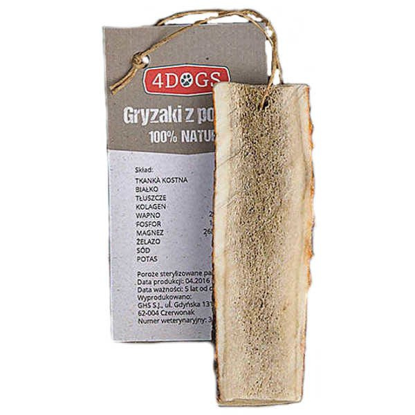 Gryzaki 4Dogs to naturalne i zdrowe przysmaki dla psów wszystkich ras. Każdy gryzak został wyprodukowany ręcznie z tzw. zrzutów, czyli poroży naturalnie gubionych w polskich lasach, każdego roku na wiosnę, przez dziko żyjące jelenie, daniele i łosie. Gryzaki produkowane są bez żadnych sztucznych dodatków. Bogate w kolagen, białko, wapno, sód, fosfor, magnez, żelazo, oraz potas. Doskonałe dla psów wszystkich ras, w każdym przedziale wiekowym z wyjątkiem szczeniąt i starych psów, bez względu na wielkość psa. Wszystkie poroża, z których produkujemy nasze naturalne gryzaki, podlegają rygorystycznej selekcji jakościowej. Na potrzeby gryzaków wybierane są wyłącznie sztuki najlepsze jakościowo. Poroża są także sterylizowane gorącą parą wodną.