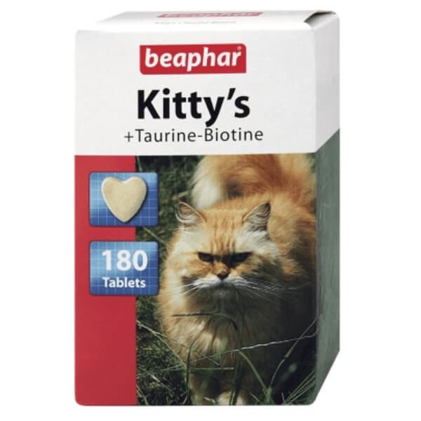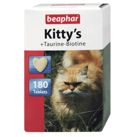 Beaphar Kitty's Taurine-Biotine przysmak witaminowy z tauryną i biotyną, zawiera witaminy z grupy B, uzyskane z naturalnych drożdży, witaminę C i E oraz minerały. Dodatek tauryny stymuluje właściwą pracę serca, mózgu i korzystnie wpływa na wzrok, zawartość biotyny gwarantuje zdrową skórę i błyszczącą sierść.