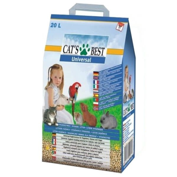 Cats Best Universal jest ekologicznym żwirkiem dla kotów. Żwirek ten jest bardzo chłonny (powyżej 700 % swojej objętości) i nie pozwala przebić się nieprzyjemnym zapachom. Naturalna pułapka dla bakterii! Nie powoduje żadnych alergii, ma naturalny zapach, dzięki któremu Twój kot łatwo się przyzwyczai do korzystania z kuwety. Jest lżejszy od żwirków mineralnych, dzięki czemu wystarczy na dłużej. Jest w 100 % biodegradowalny i produkowany z odtwarzalnych surowców - najdelikatniejszych czystych włókien roślinnych. Może być spłukiwany w toalecie!
