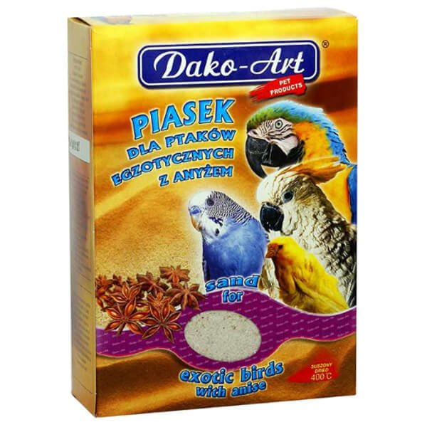 Piasek anyżowy dla ptaków Dako Art to piasek dedykowany wszystkim ptakom a jego przeznaczeniem jest utrzymanie higieny oraz pielęgnacji ptaków. Wykonany został przez polską firmę, która od lat zajmuje się produkcją artykułów dla zwierząt egzotycznych. Najwyższej jakości składniki dają gwarancję zadowolenia pupila i jego opiekuna. Piasek anyżowy dla ptaków Dako Art dodaje ptakom energii i witalności na każdy dzień. Jest jadalny i pozytywnie wpływa na pracę układu pokarmowego. Ten mineralny piasek suszony był w temperaturze 400 st. C aby zagwarantować najwyższą jakość. Produkt ten nie wydziela żadnych zapachów, jest w pełni bezpieczny dla ptaków. Co więcej, piasek ten wchłania wilgoć i zapachy a także działa toksycznie na pasożyty i odstrasza owady.