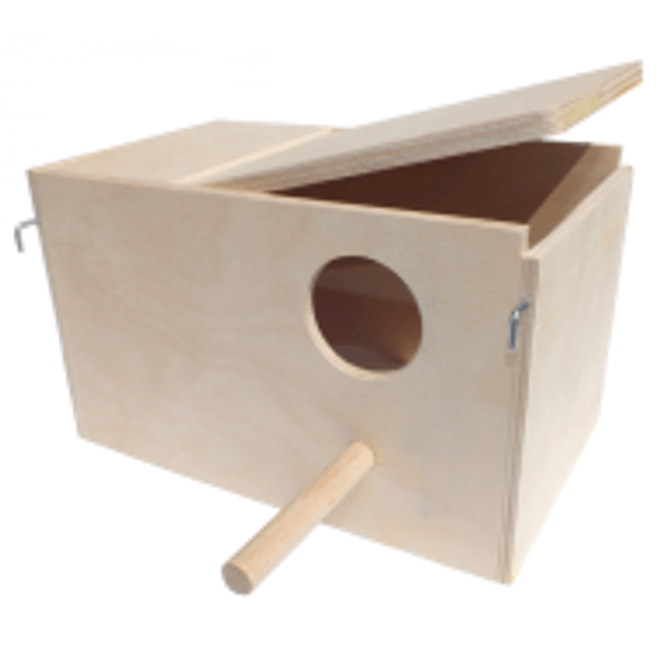 Polska budka lęgowa dla Nimfy, wykonana ręcznie, z naturalnego drewna. Duża, do zamocowania wewnątrz lub na zewnątrz klatki z papugami. W podstawie budki zamontowano zagłębienie na jajeczka. Wykonana jest z naturalnego drewna, na wejściu do domku zamontowano żerdkę. Lęgówka jest wyposażona w komplet haczyków do zawieszenia. To zaciszne miejsce dla ptaków, idealne do składnia jaj.