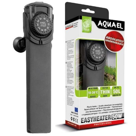 Grzałka EASYHEATER posiada korpus ze specjalnej kompozycji tworzyw sztucznych. Jest nietłukąca i wyjątkowo odporna nawet na silne uderzenia. Wyróżnia się funkcjonalnym kształtem: jest płaska, cienka i niewielkich rozmiarów, co pozwala na łatwe ukrycie jej w akwarium. Grzałka jest wyposażona w podwójną, uniwersalną zawieszkę, która pozwala na mocowanie do szyby w dowolnej pozycji, również poziomo. Na froncie grzałki umieszczono krąg diod LED, dzięki któremu możemy monitorować funkcje i pracę urządzenia. Prostą obsługę programatora zapewnia system „one-touch", czyli jeden przycisk umieszczony na górze. Poza diodą obrazującą temperaturę zaprogramowaną w akwarium świeci się jeszcze dioda, która sygnalizuje temperaturę aktualną. Jeśli jest ona niższa od zaprogramowanej, dioda ta miga powoli, co świadczy o trybie pracy. Natomiast jeżeli temperatura w zbiorniku (np. w czasie upałów) jest wyższa od ustawionej sygnalizująca ją dioda będzie migać bardzo szybko alarmując o możliwości przegrzania wody w akwarium. We wnętrzu grzałki EASYHEATER zainstalowano również ochronny wyłącznik termiczny. Oznacza to, iż w przypadku omyłkowego włączenia jej poza wodą, lub też niekontrolowanego wycieku wody ze zbiornika grzałka nie przepali się, nie spowoduje zagrożenia pożarowego lecz automatycznie się wyłączy. Jej powtórne włączenie również nastąpi samoczynnie, ale po całkowitym ostygnięciu. Jest przystosowana do pracy w zakresie temperatur od 18 do 36ºC, może więc znaleźć zastosowanie w zbiornikach ze zwierzętami, które wymagają specyficznych warunków termicznych, np. dyskowce. Idealnie nadaje się do zbiorników o pojemności 25 - 50 l.