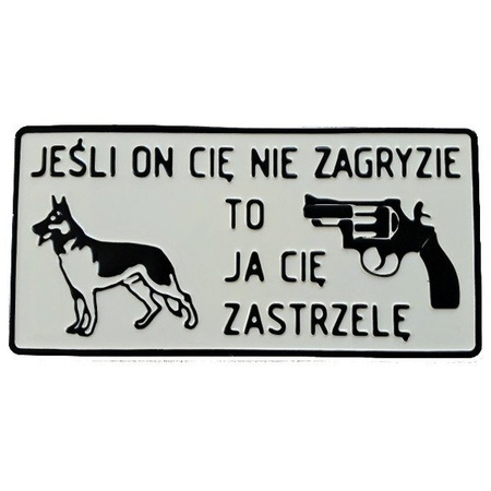 Solidnie wykonana, tłoczona, metalowa tabliczka z napisem "JEŚLI ON CIĘ NIE ZAGRYZIE..." w kolorze srebrnym. Do powieszenia na bramie lub furtce. Odporna na warunki atmosferyczne. Wykonywane w technologii tłoczenia aluminium tablice ostrzegawcze ze względu na swoją estetykę i trwałość, a także oryginalny wygląd, są miłym dodatkiem dla Twojego domu czy ogrodzenia. Czcionka dobrana jest w taki sposób, że już z daleka tablica jest bardzo czytelna.