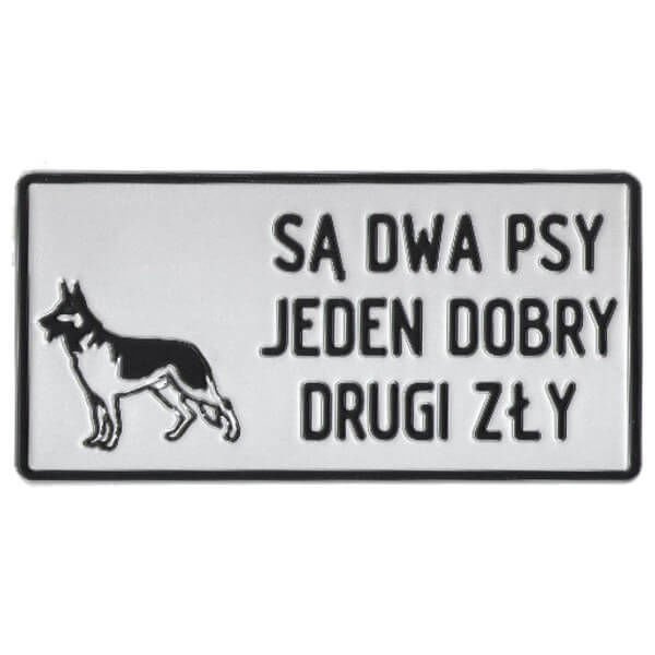 Solidnie wykonana, tłoczona, metalowa tabliczka z napisem "SĄ DWA PSY, JEDEN..." w kolorze srebrnym. Do powieszenia na bramie lub furtce. Odporna na warunki atmosferyczne. Wykonywane w technologii tłoczenia aluminium tablice ostrzegawcze ze względu na swoją estetykę i trwałość, a także oryginalny wygląd, są miłym dodatkiem dla Twojego domu czy ogrodzenia. Czcionka dobrana jest w taki sposób, że już z daleka tablica jest bardzo czytelna.