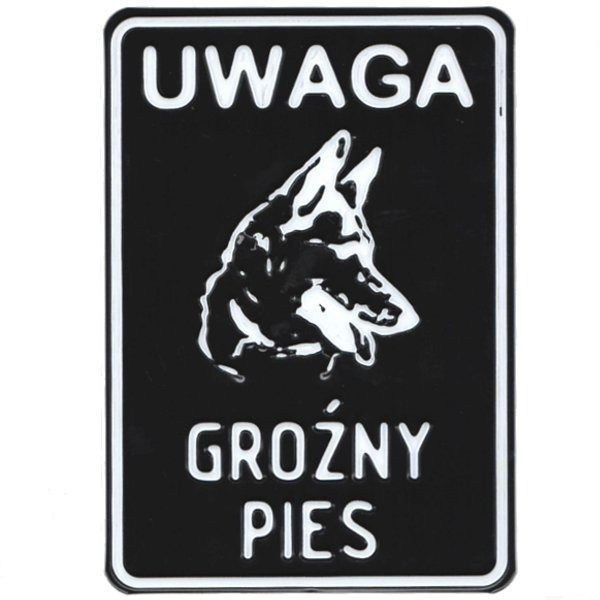Solidnie wykonana, tłoczona, metalowa tabliczka z napisem "UWAGA, GROŹNY PIES" w kolorze czarnym. Do powieszenia na bramie lub furtce.