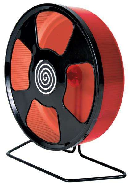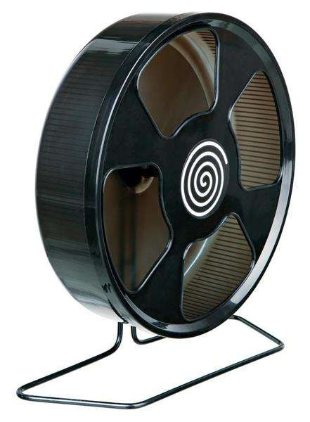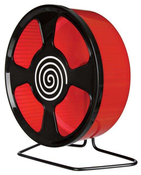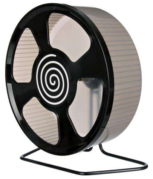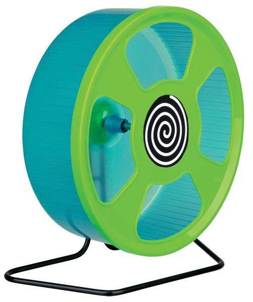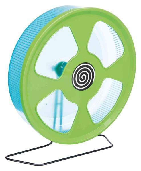 Trixie kołowrotek dla chomików, myszy i koszatniczek w zależności od średnicy kółka. Dzięki idealnemu profilowi koła chroni kręgosłup gryzonia. Jest szczególnie cichy i płynnie się obraca. Płaska powierzchnia (bez szczebelków) ze wzmocnieniem bocznym zapewnia lepszy uchwyt. Ma bezpieczny i stabilny stojak, można go również zawiesić. Wykonany jest z nietoksycznych materiałów. Bezpieczny stojak i zamknięta ścianka tylna zapobiegają przewróceniu się zabawki.