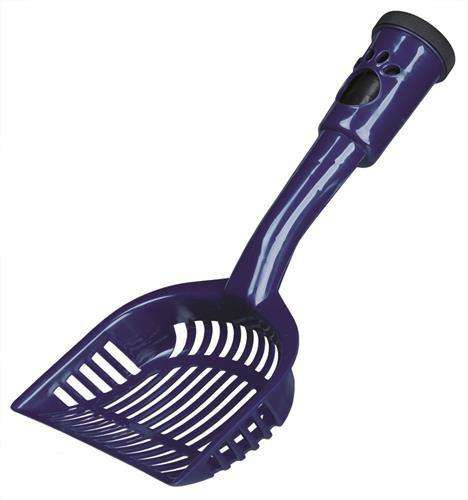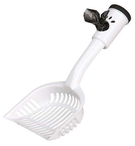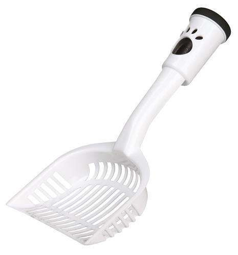 Plastikowa i pojemna łopatka do sprzątania kuwety. Idealnie nadaje się do czyszczenia większych i głębszych kuwet. W rączce ukryty jest schowek na worki.