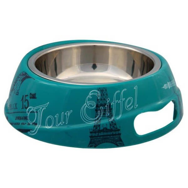 Miska Combo Paris firmy Trixie dla psa z melaminy o teksturze zabytków Paryża. Wykonana jest z trwałego i odpornego na uszkodzenia tworzywa. Nowoczesny design, modna kolorystyka i kształt wspaniale wkomponowuje się we wnętrza każdego mieszkania. Wyciągany metalowy środek zostały wykonany z wysokiej jakości stali nierdzewnej, co chroni przed zarysowaniami i pozwala na łatwe czyszczenie. Miska posiada gumowe, antypoślizgowe podnóżki, które zapobiegają przesuwaniu się, a tym samym rozsypywaniu karmy przez Twojego psa. Waga miski wpływa na jej stabilność. Otwór w tylnej części ułatwi jej przenoszenie.