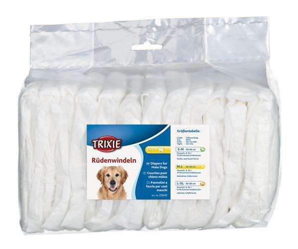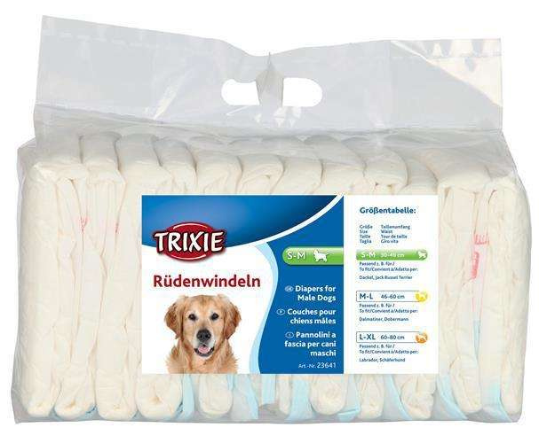 Pieluchy jednorazowego użytku dla dorosłych psów firmy Trixie. Mogą być również zakładane psom nietrzymającym moczu, po zabiegach operacyjnych czy w podróży. Pas na podbrzusze można zakładać psom, aby zapobiegać znaczeniu terenu moczem. Dzięki paskom elastycznym i rzepom dobrze przylegają do ciała Twojego psa. Ten rodzaj pieluch nie jest przeznaczony dla suczek, ze względu na ich inną budowę anatomiczną. Mogą być również zakładane dla szczeniaka w podróży, który jeszcze nie nauczył się higieny. Mają wysoka absorpcyjność płynów.