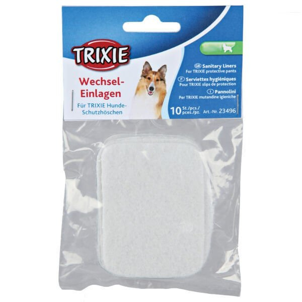 Wkładki do majtek ochronnych firmy Trixie, idealne na okres cieczki Twojego psa. Absorbują podczas rui. Nadają się jako wkładki wymienne do wszystkich majtek ochronnych firmy Trixie. W opakowaniu znajduje się 10 szt wymiennych wkładów.