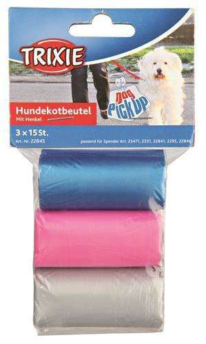 Trixie woreczki na odchody z uchwytami, 3 rolki po 15 sztuk w komplecie. Woreczki posiadają uchwyty i nadają się do wykorzystania w każdego rodzaju podajniku. Są idealne, ponieważ możesz je zabrać ze sobą na długi spacer czy w podróż. Uchwyt bardzo łatwo pozwoli na zamknięcie torby. To niezbędny produkt, dla każdego właściciela, który dba o czystość po swoim psie.