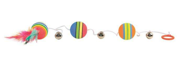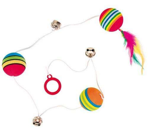 Świetna zabawka dla kota, która sprawi wiele radości! Całość składa się z trzech tęczowych piłeczek z gąbki, na której umieszczone są również trzy metalowe dzwonki, a to wszystko jest połączone gumką. Na jednym końcu znajdują się dodatkowo piórka pobudzające kota do aktywności, zaś na drugim jest kółko które ułatwia trzymanie całej zabawki.