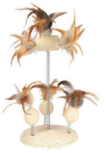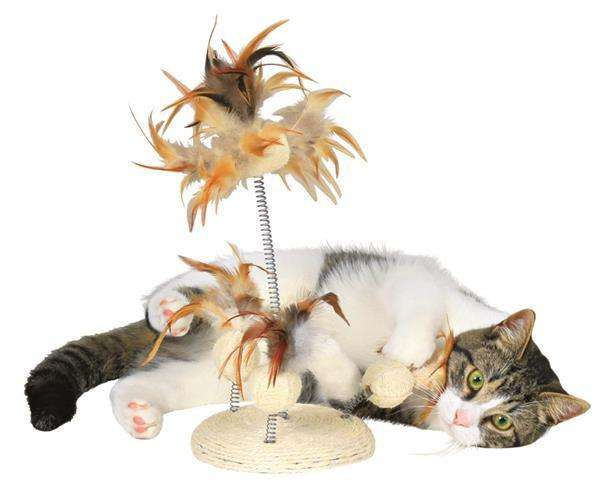 Zestaw zabawek Trixie z piórami zapewni kotu zabawę. Posiada również funkcje drapaka, który pozwala zadbać o stan pazurów Twojego pupila. Zabawka wykonana jest z sizalu, na sprężynkach zamontowano kule z trukwy (roślina kabaczkowata) i piórami. W doskonały sposób zapewnisz aktywizację nawet najbardziej leniwego kota. Elementy z piórkami uderzone łapką są wprawione w ruch, takiemu polowaniu na nie nie oprze się żaden łowca.