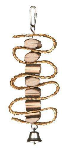 Zabawka Trixie wykonana z naturalnego drewna. Z drewnianą zawieszką i ze słomianą wstążką idealna do obgryzania przez ptaki.