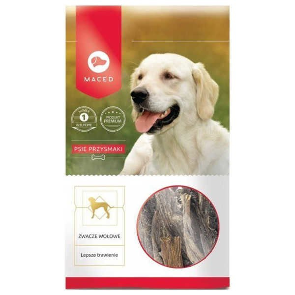 Suszony żwacz wołowy od polskiej marki Maced to smakołyk, który dzięki najnowszym, specjalnym technikom suszenia, nie traci swojej zawartości kultur bakterii. Jest naturalnym, wysokoenergetycznym przysmakiem dla psów. W organizmie psa wspomaga naturalne procesy trawienia, poprawia perystaltykę jelit, wpływa na poprawę apetytu, ale przede wszystkim chroni przed dysbakteriozą. Stymuluje florę jelitową psa, co zapobiega zatruciom pokarmowym oraz przeciwdziała biegunkom. Nieodzowny składnik diety dla psów z koprofagią.