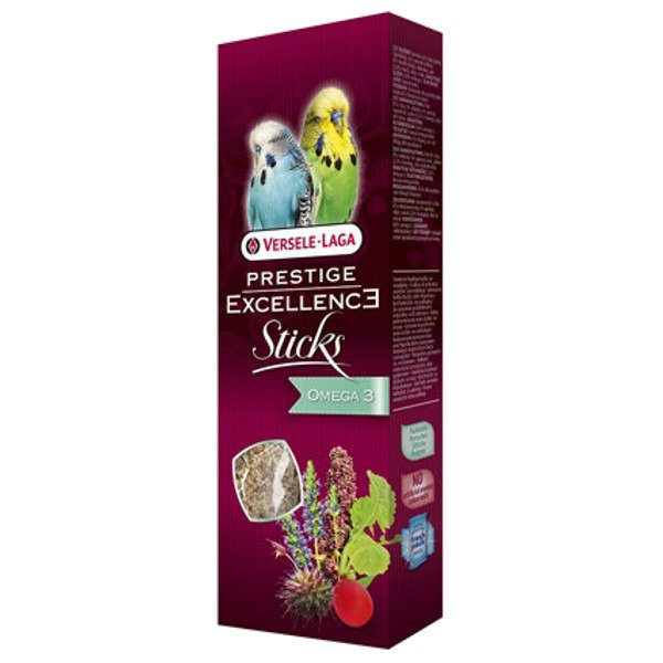 Versele Laga Prestige Excellence Sticks Omega 3 to wypiekane w piecu kolby dla papug falistych. Mieszanka zawierająca nasiona, zboża, oleje i tłuszcze stanowi pełnowartościowe pożywienie. Kolby cechują się naturalnymi składnikami, bez sztucznych barwników i aromatów. Regulowana zawieszka pozwala na umieszczenie kolby w dowolnym miejscu klatki. Pakowanie w systemie FreshPack zapewnia zachowanie aromatu i chrupkości do momentu otwarcia opakowania.