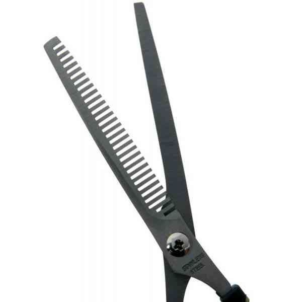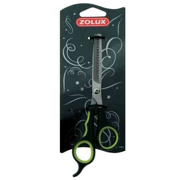 Zolux nożyczki trymerskie do dla psa lub kota. Pozwalają przyciąć zbyt długą sierść, lub przerzedzić zbyt gęstą. Wykonane ze stali nierdzewnej. Antypoślizgowe elementy zapobiegają wyślizgnięciu się nożyczek z dłoni. Ostrza zostały odpowiednio wyprofilowane, co sprawia, że nie pozostawiają nienaturalnego efektu równego ucięcia włosa. Produktu należy używać gdy sierść jest czysta, sucha i rozczesana.
