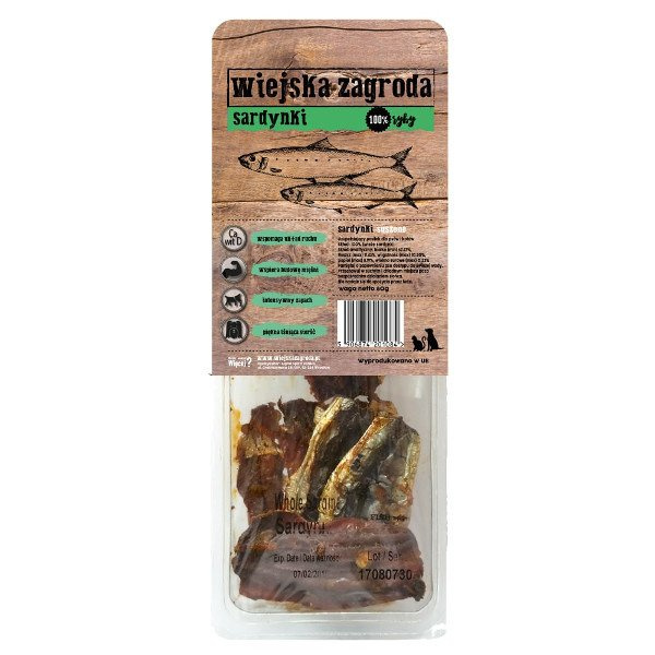 WIEJSKA ZAGRODA sardynki dla psa to miękki, suszony przysmak dla psów i kotów w każdym wieku. Jest pyszny, zdrowy i bez konserwantów. Przygotowywany tylko ze świeżych składników, pozyskiwanych od lokalnych dostawców z ekologicznych hodowli. Produkt jest zapakowany w hermetyczne opakowanie.