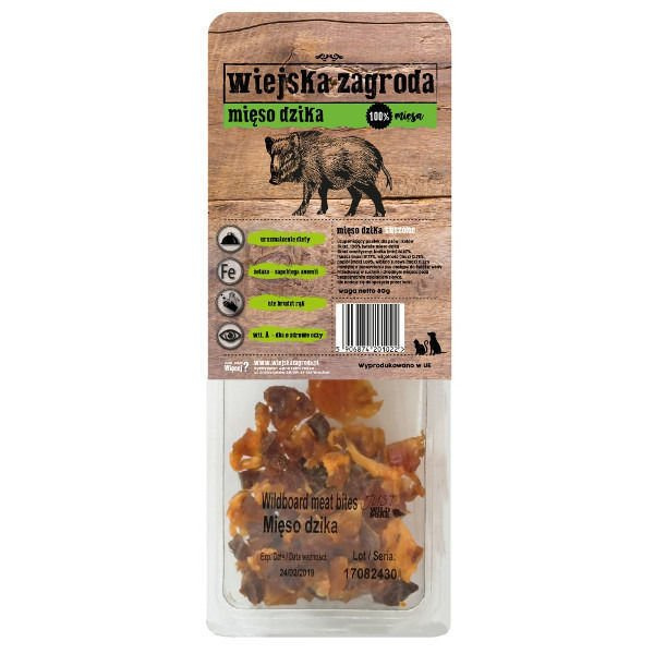 Alpha Spirit Wiejska Zagroda Mięso dzika to miękki, suszony przysmak dla psów i kotów w każdym wieku. Jest pyszny, zdrowy i bez konserwantów. Przygotowywany tylko ze świeżych składników, pozyskiwanych od lokalnych dostawców z ekologicznych hodowli.
