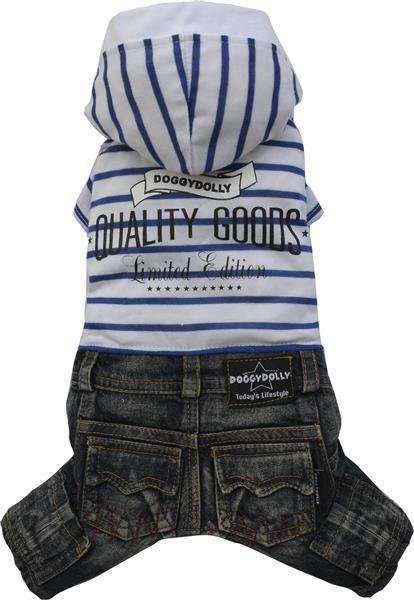 Doggy Dolly proponuje komplet, bluzę i spodnie jeans. Spodnie są czarne, z kieszeniami, natomiast bluza ma kaptur. Na plecach stylowy firmowy nadruk Doggy Dolly. Takie ubranie wyróżni Twojego psa w tłumie. Spodnie wykonane są z prawdziwej tkaniny dżinsowej, stonewashed, w stylu czarno-vintage, z typowymi dżinsowymi szwami. Komplet jest idealny na jesienne spacery, dla psów małych ras. Zapinane pod brzuchem na wygodne napy. Dzięki miękkiemu materiałowi strój jest wygodny dla psa i nie ogranicza swobody ruchów. Ubranko można prać w temperaturze 30 °C.
