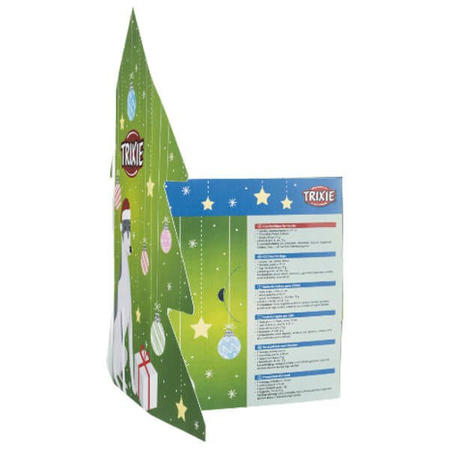 Twój czworonożny przyjaciel również zasługuje na prezent pod choinką. Paczka przygotowana przez firmę Trixie doskonale się do tego nadaje. W ładnym pudełku w kształcie choinki znajduje się bawełniany sznur w świątecznych kolorach, pyszna przekąska ze zwiniętej skóry cielęcej owiniętej filetem z kurczaka, smakowite dropsiki czekoladowe z witaminami oraz piszcząca zabawka z pluszu. Podkręć świąteczny klimat, dając więcej radości swojemu Pupilowi!