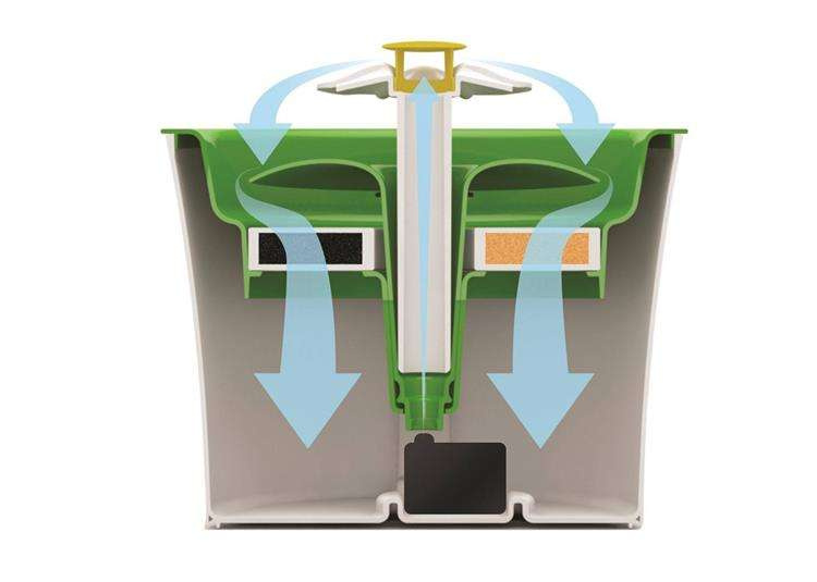 W przeciwieństwie do większości fontann do picia, ta nie posiada miski, więc brud nie może się w niej gromadzić. Woda przepływa przez trójstopniowy filtr oczyszczający ją z zawiesin i osadów, zapobiegający rozwojowi bakterii i usuwający chlor, tak jak jego pochodne oraz zmiękcza wodę usuwając z niej magnez i wapń przez co chroni układ moczowy kota. Filtr utrzymuje trwałość przez 30 dni.