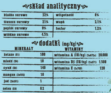 Skład: świeże białoryby 17%, suszony śledź 17%, suszony łosoś 17%, świeży olej z łososia 11,5%, groszek, groszek łuskany, suszone płatki ziemniaków, hydrolizowane białko zwierzęce 5%, suszone drożdże browarnicze, nasiona lnu, pulpa buraczana, włókno roślinne, minerały, suszona cykoria (naturalne źródło FOS i inuliny), MOS (manno - oligosacharydy), suszone gruszki, glukozamina, chondroityna, wyciągi roślinne (rozmaryn, cytrusy, kurkuma, winorośl, czapetka, Yucca Schidigera).