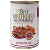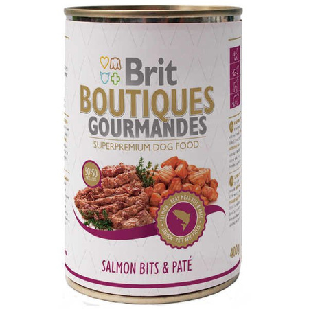Wysoka zawartość wysokiej jakości mięsa i jego staranne przetwarzanie to gwarancja doskonałego smaku i aromatu. Brit Boutiques Gourmandes Salmon Bits & Paté to unikalne połączenie kawałków łososia z delikatnym pasztetem. Doskonale zaspokaja apetyt nawet najbardziej wymagającego psa. Bez zbóż, konserwantów i sztucznych barwników.