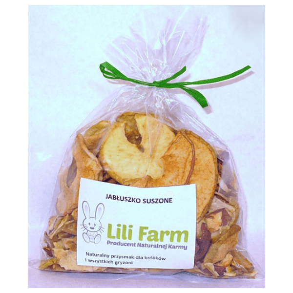 Lili Farm jabłuszko suszone dla królika i gryzoni z wyjątkiem koszatniczki, skutecznie poprawia procesy trawienia, obniża poziom cholesterolu, neutralizuje wolne rodniki. Jabłko zawiera mnóstwo błonnika, witamin z grupy B i C oraz potas. Ma właściwości odżywcze, wzmacniające, oczyszczające. Owoce jabłoni bardzo korzystnie wpływają na układ pokarmowy szczególnie przy występowaniu biegunek, nieżytów żołądka i infekcjach jelit królika i gryzoni.
