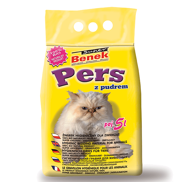 Polski, zbrylający żwirek bentonitowy o naturalnym zapachu glinki. Żwirki higieniczne Super Benek Pers to produkty dedykowane dla kotów długowłosych. Dzięki zastosowanej technologii otrzymuje się regularne ziarenka o gładkiej powierzchni, co zapobiega zaczepianiu się żwirku na futrze. Wyroby oferowane są w postaci granulek o wielkości 1 mm. Produkt zawiera specjalne saszetki z pudrem, których zawartość zwiększa wydajność podłoża.