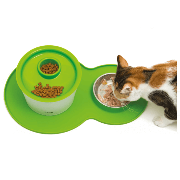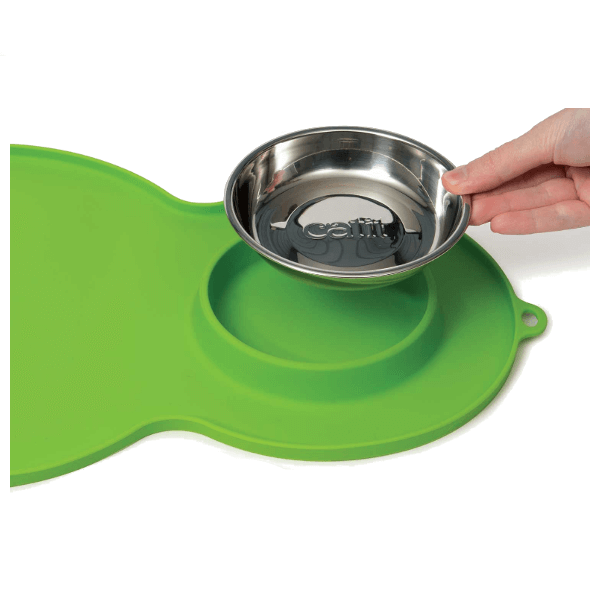 Catit miękka, silikonowa podkładka z miską ze stali nierdzewnej dla Twojego kota. Można ją używać pod fontannę Catit, jednocześnie podając karmę. Podkłada posiada szlufkę do łatwego suszenia lub zawieszania na haczyku po skończonym posiłku. Wyższy brzeg ochroni Twoją podłogę lub blat przed wysypaniem karmy, czy rozlaniem wody przez kota. Miskę można myć w zmywarce. Płytki kształt miski sprawia, że Twój kot może jeść wygodnie, bez obciążania wąsów. Doskonale trzyma się podłoża, dzięki czemu Twój pupil może skupić się na wcinaniu posiłku! Podkładka została wykonana z silikonu spożywczego, który jest łatwy do utrzymania w czystości.