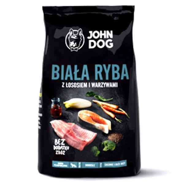 John Dog wysokiej jakości pełnoporcjowa, sucha karma dla dorosłych psów średnich i dużych ras. Połączenie białych ryb i łososia (ponad 60% białka w karmie pochodzi z ryb) z dodatkiem ziemniaków, groszku, drożdży browarnianych, siemienia lnianego i świeżego oleju z łososia. Ryba jest źródłem dobrze przyswajalnego białka o wysokiej wartości odżywczej. Zawiera cenne kwasy wielonienasycone, w tym DHA i EPA, które wspierają odporność organizmu, poprawiają krążenie, pozytywnie wpływają na funkcjonowanie układu nerwowego, usprawniają procesy uczenia się oraz chronią przed chorobami nerek i serca. Wielonienasycone kwasy tłuszczowe są również niezbędne do prawidłowego funkcjonowania skóry oraz utrzymania w dobrej kondycji sierści. Karma zawiera glukozaminę i chondroitynę, które korzystnie oddziałują na stawy i kości. Dodatek syzygium – kompozycji ziół – ma działanie antyoksydacyjne.