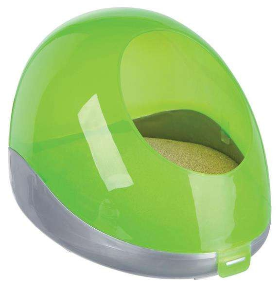Dla utrzymania pięknego wyglądu futra, szynszyle i koszatniczki wymagają kąpieli w specjalnie do tego przygotowanym pyle. Kąpiele piaskowe zapobiegają sklejaniu się sierści i sprawiają, że futerko jest bardziej puszyste. Trixie Sandbox zdecydowanie ułatwia tą czynność. Zabudowa i otwór wejściowy pod kątem 45 st. zapobiega nadmiernemu rozsypywaniu się piasku. Lekka konstrukcja i możliwość rozłożenia pojemnika ułatwia wymianę piasku i czyszczenie.