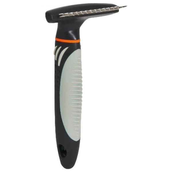 Zgrzebło Trixie jest wykonane z wysokogatunkowego i wytrzymałego plastiku oraz z metalu. Przeznaczone do rozczesywania splątanej sierści. Dzięki obrotowym zębom łatwo przechodzi przez sierść bez uszkadzania skóry czy włosów. Dzięki uchwycie wykończonym gumą antypoślizgową grzebień stabilnie trzyma się w dłoni. Grzebień jest idealny do pielęgnacji podszerstka Twojego psa.