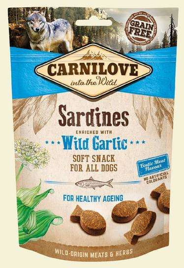 Carnilove Soft Snacks to hipoalergiczna, pyszna, miękka przekąska z sardynek z czosnkiem niedźwiedzim spowalniającym starzenie. Bez zbóż, sztucznych barwników i konserwantów.