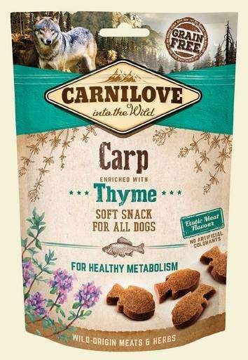 Carnilove Soft Snacks to hipoalergiczna, pyszna, miękka przekąska z karpia z tymiankiem dla zdrowego metabolizmu. Bez zbóż, sztucznych barwników i konserwantów.